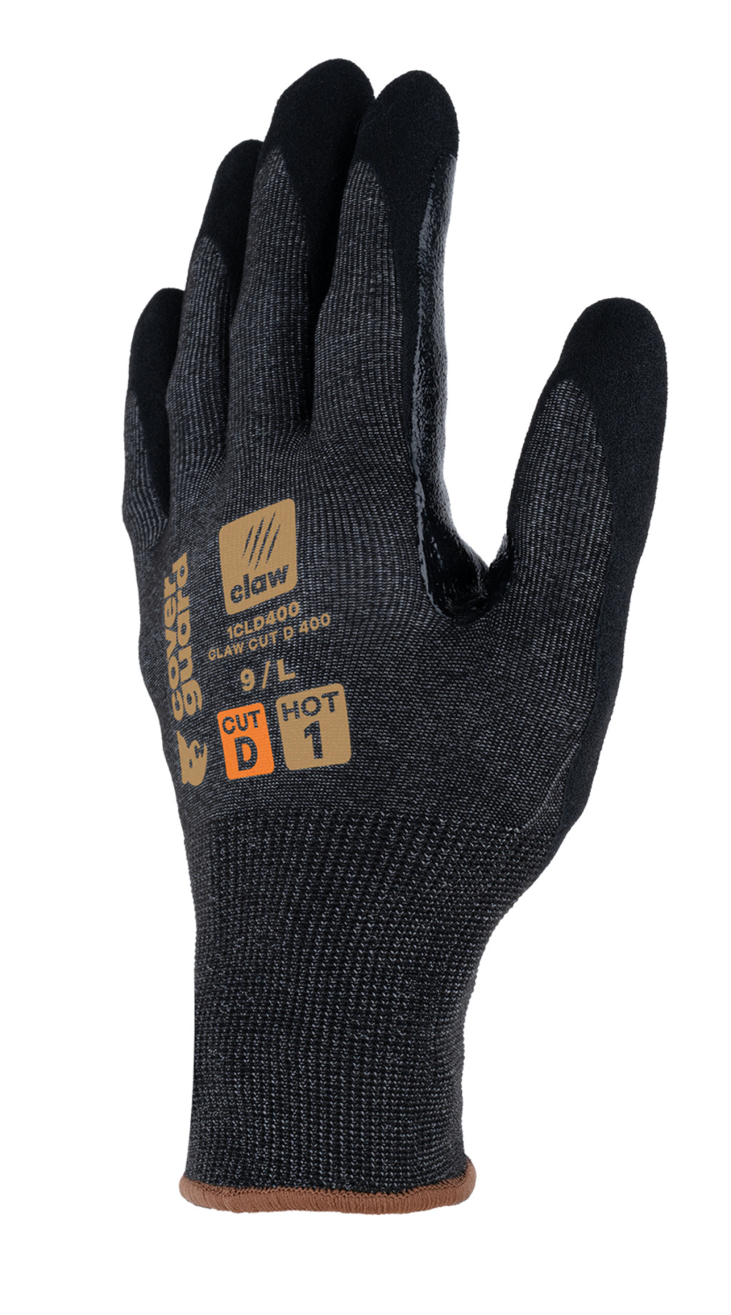 A CLAW CUT termékcsalád egy új generációs vágásálló kesztyű, amelyet arra terveztek, hogy megvédjen a legigényesebb munkák során, magas vágásállósággal (CUT D-től A9-ig), és kiváló komfortot, valamint kivételes ügyességet biztosítson minden munkakörnyezetben (száraz, nedves és olajos).A CLAW CUT D 400 modellt finom anyagmozgatási munkákhoz tervezték száraz és enyhén olajos környezetben. A magas 21-es kötés, amely egy rendkívül puha és erős üvegszál, poliészter és spandex alapú anyagból készült, második bőr érzést biztosít, miközben kiváló vágásvédelmet nyújt (CUT D).A sandy nitril bevonat és a hosszú megerősítés a hüvelykujj és a mutatóujj között kiváló tapadást és jó fogást biztosít. Ez a bevonat nagyon jó légáteresztőséget garantál (COVERPERF címkével tesztelve), valamint nagy kopásállóságot is (COVERPERF címke: >20.000 ciklus). A CLAW CUT D 400 újrahasznosított poliészterből készült, és RCS tanúsítvánnyal rendelkezik (a termék teljes súlyának 20%-a). Üvegszál nélkül.Ez a kesztyű érintőképernyő kompatibilis, így viselése közben is használhatja a kijelzővel rendelkező berendezéseket. A Sanitized kezelés megakadályozza a baktériumok és szagok fejlődését, és a CLAW CUT D 400 hypoallergén is (COVERPERF SKINCARE teszt).