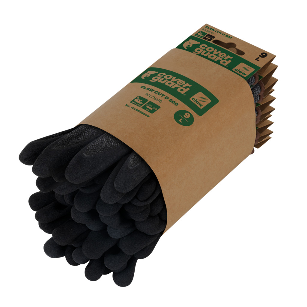 A CLAW CUT termékcsalád egy új generációs vágásálló kesztyű, amelyet azért fejlesztettek ki, hogy megvédjen a legigényesebb munkák során, magas vágásállósági szinttel (CUT D-től A9-ig), és kiváló kényelmet, valamint kivételes ügyességet biztosítson minden munkakörnyezetben (száraz, nedves és olajos).A CLAW CUT D 500 modellt finom anyagmozgatási munkákhoz tervezték száraz és olajos környezetben. A magas 21-es kötés, amely egy rendkívül puha és erős üvegszál, poliészter és spandex alapú anyagból készült, második bőr érzést nyújt, miközben kiváló vágásvédelmet biztosít (CUT D).A tenyér nitrillel bevont, dupla rétegű, szemcsézett / homokszerű felülettel rendelkezik, vízálló, és a hüvelykujj és a mutatóujj közötti hosszú megerősítés kiváló tapadást és jó fogást biztosít a legigényesebb munkák során száraz és olajos környezetben, valamint magas szintű kopásvédelmet nyújt (COVERPERF címke: >20.000 ciklus).A CLAW CUT D 500 újrahasznosított poliészter szálból készült, amely RCS tanúsítvánnyal rendelkezik (a termék teljes súlyának 14%-a). Üvegszál nélkül.Ez a kesztyű érintőképernyő-kompatibilis, így viselése közben is használhatja a képernyős berendezéseket. Sanitized kezelés: megakadályozza a baktériumok és szagok fejlődését, és a CLAW CUT D 500 hypoallergén is (COVER