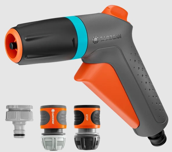 A Classic Tisztító locsolópisztoly kezdő készlet két vízsugárformával rendelkezik tisztításhoz és öntözéshez, és a szezonban UV- és alkalmi fagy ellen védett.