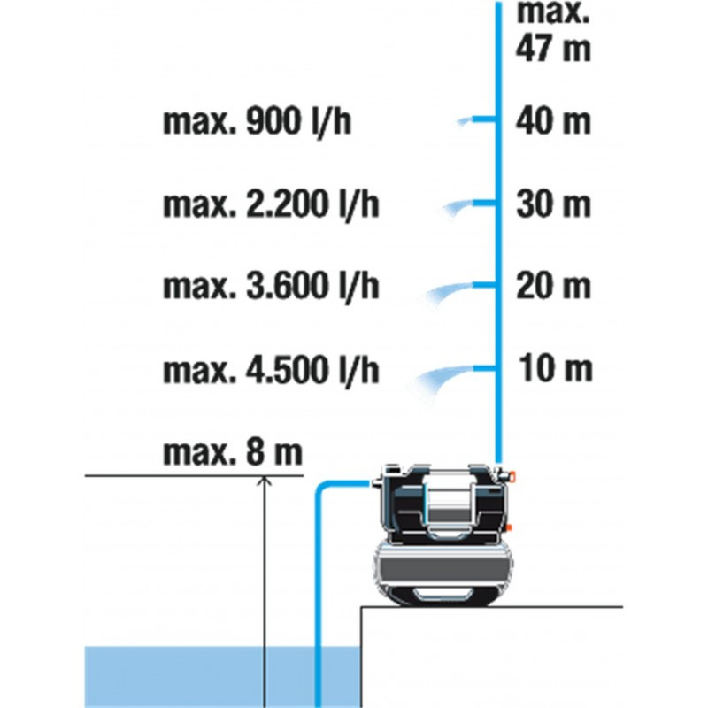 Tápfeszültség 1~230 V, 50 Hz Kábel hossza 1,5 m IP védelem IPX4 Szívómagasság 8 m Szállítási magasság 47 m Teljesítmény 900 W Max. folyadékszállítás 5600 l/hod