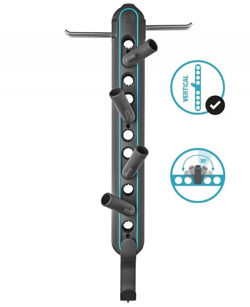 A GARDENA combisystem Flex szerszámtartón helytakarékosan tárolhatod a GARDENA combisystem tartozékokat és nyeleket. A Szerszámtartó Flex négy szerszámtartóval van felszerelve, egy kis kampóval a kisebb szerszámok, metszőollók és ollók tárolására, valamint egy univerzális kampóval. A szerszámtartók rugalmasak és szabadon csatlakoztathatók, és 30°-ban elforgathatók, hogy helyzetüket az igényeidhez igazítsd. A tartók a GARDENA combisystem és az Original GARDENA System tartozékok tárolására alkalmasak. Az univerzális kampón tárolhatók a kerti szerszámok, például ásók. A szerszámtartó állványt függőlegesen vagy vízszintesen is elhelyezheted, hogy a falon lévő helyet optimálisan kihasználhasd. Ezenkívül a szerszámtartó fém akasztóin akár négy combisystem nyélnek is van hely. Ha több szerszámot szeretnél tárolni, akkor az állványt a Flex Szerszámfejtartó betéttel (cikkszám: 3507-20) meghosszabbíthatod. A nem combisystem nyeleket a Nyéltartó Flex-en (cikkszám: 3508-20) vízszintesen tárolhatod. A gardena.com/registration oldalon történő regisztrációt követően a vásárlást követő 3 hónapon belül a GARDENA 25 év szavatosságot vállal a combisystem Flex szerszámtartóra. Hagyd, hogy szerszámcsaládod bővüljön. GARDENA combisystem Cserélhető. Tartós. Bármilyen kertészeti feladathoz.