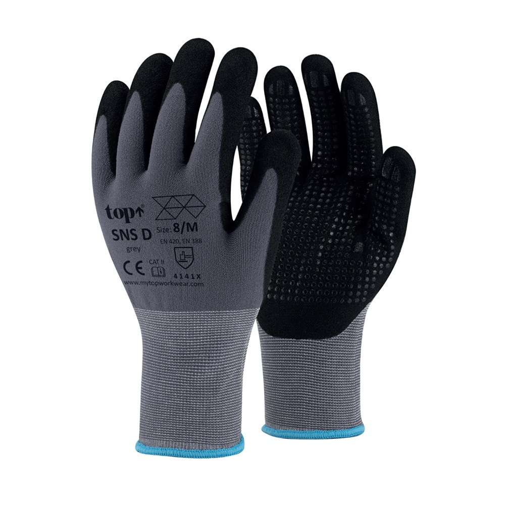A TOP SNS-D egy magas minőségű, kevertszálas alapanyagból készült védőkesztyű, mely homokszemcsés nitril habba ujjvégig mártott bevonattal rendelkezik. A tenyéren található nitril pontozás tovább növeli a fogásbiztonságot, így még nedves vagy csúszós környezetben is biztos tartást nyújt.