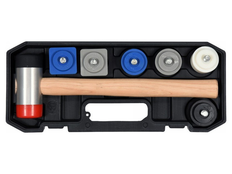 Csereélhető fejekkel ellátott szerelőkalapács, 8 különböző keménységű fejjel. A fejek tartós PI, PUR műanyagból készülnek. Alumínium alapú ötvözet kalapácsfej, melyet véglegesen egy 320mm hosszú fa nyélre erősítettek. A készletben kerek fejek 42,5mm átmérővel és négyzet alakú fejek 43x43mm méretben találhatóak. Az elérhető keménységek lehetővé teszik, hogy az eszközt a különböző anyagokkal végzendő munkához igazítsa. Szürke fejek - keménység kb. 65 hrc Piros végződések - keménység kb. 72 hrc Kék végződések - keménység kb. 73 hrc Fehér vég - keménység kb. 80 hrc Fekete fejek - keménység kb. 95 hrcBádogos, tetőfedő és szerelési munkákhoz. Használata alapos munka utánHasználata a kívánt keménységű és alakú fej gondos becsavarása után. Nyélre erősített fej, nyolc különböző keménységű fejjel. Használata a kívánt keménységű és alakú fej gondos becsavarása után. Használati figyelmeztetések: A kéziszerszámok használata veszélyes lehet! Mindig használjon személyes védőfelszerelést munka közben. Csak megfelelő és sérülésmentes szerszámokat használjon. Válassza ki a szerszám típusát és méretét a tervezett felhasználás szerint. Ne terhelje túl a szerszámokat. Tartsa a szerszámokat távol a gyermekektől. Gondosan használja a szerszámokat.