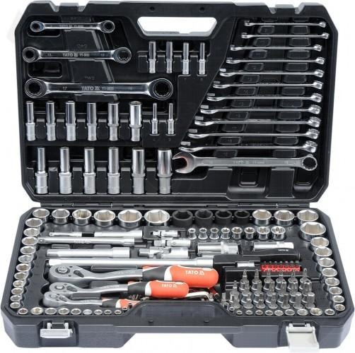Egy professzionális szerszámkészlet, amelyet kifejezetten autó- és gépszerelő szakemberek igényeire fejlesztettek ki. A villáskulcsok és a tartó meghajtása strapabíró, szerszámvánádium-acélból készült (CRV 50BV3). A tartókat mátrix módszerrel készítették, és a keményítési folyamat előtt precíz illesztésekkel és ellenőrző eszközökkel kalibrálták. A tartók az AS-Drive rendszerrel vannak ellátva, amely 25%-kal növeli a maximális pillanatot, teljes védelemmel a sapka vágója számára, a tartó kétszínű felülettel rendelkezik. A készletben található bitek kemény S2 acélból készültek. A készlet lehetővé teszi a nagyon magas terhelést és precizitást igénylő munkák elvégzését, lehetővé teszi a különböző névleges méretű menetes kapcsolatok csavarásával és csavarásával kapcsolatos számos szerviz tevékenység elvégzését. A racsnik háromszögletű fogantyúval és 72 fogakkal rendelkeznek (5 fokos munkaütem). 1/2 'tartók: 20; 21; 22; 24 mm, l = 38 mm, 27; 30; 32 mm, l = 42 mm sapkák 1' 17; 19; 21; 23mm hosszú sapkák 1/2 ': 10; 12; 13; 14; 17; 19 mm, l = 76 mm 1/2 'sapkák: 15/16'; 1 ''; 1-1/16 '; 1-1/4' '' 3/8 'tartó: 9, 10; 11; 12; 13; 14; 15; 16 mm, L = 28 mm; 17; 18; 19 mm, l = 30 mm hosszú 3/8 ': 10; 11; 12; 13; 14; 15 mm, l = 63 mm 3/8' sapkák: 3/8 ''; 7/16 ''; 1/2 ''; 9/16 ''; 5/8 ''; 11/16 ''; 3/4 ''; 13/16 ''; 7/8 '' sapkák 3/8 'TORX: E8; E10; E11; E12; E14; E16; E18; E20 Pods 1/4': 4; 5; 6; 7; 8; 9; 10; 11; 12; 13 mm, L = 25 mm hosszú 1/4 ': 4; 5; 6; 7; 8; 9 mm, l = 50 mm sapkák 1/4' inch: 5/32 ''; 3/16 ''; 7/32 ''; 1/4 ''; 9/32 ''; 5/16 ''; 11/32 ''; 3/8 ''; 7/16 ''; 1/2 ''; Ratrotka 1/2 ': 72t, 255 mm racsni 3/8': 72t, 200 mm racsni 1/4 ': 72t, 155 mm csavarhúzó fogantyú 1/4', 150 mm hosszabbító 1/2 ': 127 mm; 254 mm 3/8 'hosszabbítók: 76 mm; 152.4 mm 1/4 'hosszabbítók: 50.8 mm 3/8 gyertya sapkák: 16; 21 mm Cardana csukló: 1/2 '; 3/8' 'és 1/4' '' 1/4 'TORX bitfejek: T10; T15; T20; T25; T27; T30; T40 TORX csavarhegyek a 3/8 'tartón: T20; T30; T40; T45; T50; T55; T60 Philips csavarhúzók a 3/8 '-en: PH1; PH2 PH3 Keresztcsavarhegyek a 3/8 'kapcsolón: PZ1; PZ2, PZ3 Lapos csavarhúzó a 3/8 '-en: 4, 5.5; 6.5 mm hatszögű csavarhúzó a 3/8 '-en: 3; 4; 5; 6; 6, 10 mm Csillagkulcsok: 8; 9; 10; 11; 12; 13; 14; 15; 16; 17; 18; 19 mm racsnis végű gyűrűkulcsok: 8x10; 12x13; 17x19 mm Imbuszkulcsok: 1.5; 2; 2.5; 3; 4; 5; 6; 7; 8; 8; 10 mm Használati figyelmeztetések: Figyelem! Mindig használjon személyes védőfelszerelést munka közben.