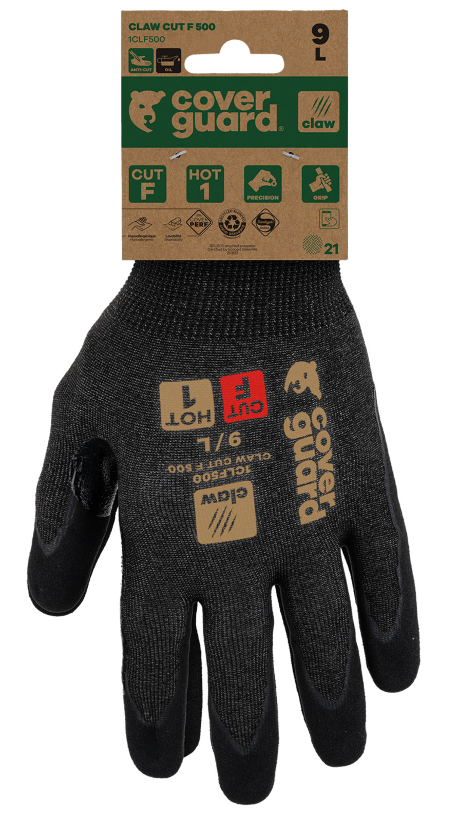 A CLAW CUT termékcsalád egy új generációs vágásálló kesztyű, amelyet a legigényesebb munkákhoz terveztek, magas vágásállósági szinttel (CUT D-től A9-ig), és kiváló kényelmet, valamint kivételes ügyességet biztosít minden munkakörnyezetben (száraz, nedves és olajos).A CLAW CUT F 500 modell finom anyagmozgatásra lett kifejlesztve száraz és olajos környezetben. A magas 21-es kötés, amely egy rendkívül puha és erős üvegszál, poliészter, acél és spandex alapú anyagból készült, második bőr érzést nyújt, miközben maximális vágásvédelmet biztosít (CUT F, az EN388 szabvány szerint).A nitril dupla rétegű tenyérbevonat szemcsézett felülettel vízálló, és a hosszú megerősítés a hüvelykujj és a mutatóujj között kiváló tapadást és jó fogást biztosít a legigényesebb munkák során száraz és olajos környezetben.A CLAW CUT F 500 újrahasznosított poliészterből készült, és RCS tanúsítvánnyal rendelkezik (a termék összsúlyának 16%-a). Üvegszál nélkül.Ez a kesztyű érintőképernyő kompatibilis, így viselése közben is használhatja a képernyős berendezéseket. Sanitized kezelés: megakadályozza a baktériumok és szagok fejlődését, és a CLAW CUT F 500 hypoallergén is (COVERPERF SKINCARE teszt).