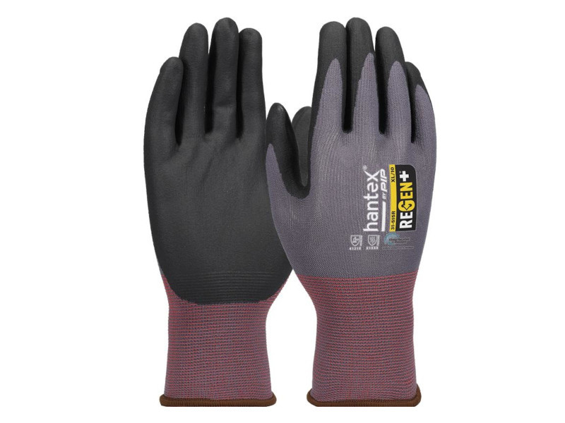 HANTEX REGEN kötött, poliészter, nitril tenyérmártott munkavédelmi kesztyű – bliszteres kiszerelésKörnyezetbarát, újrahasznosított poliészterből készült kesztyű 15 gauge varratmentes kötéssel és habosított nitrilbevonattal.Főbb jellemzők:Erős tapadás száraz és olajos környezetbenKiváló kopásállóság, rugalmas és kényelmes viseletMinden pár újrahasznosított palackokból készülEnergia-, víz- és hulladékmegtakarítás a fenntarthatóság jegyébenHatékony védelem környezetkímélő formában – kompromisszumok nélkül.
