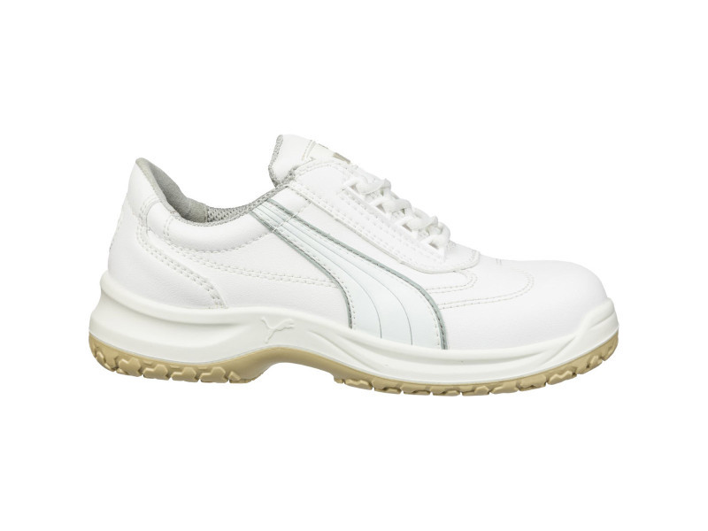 PUMA WHITE 'N SERVICE CLARITY LOW biztonsági cipőAz IQ.CELL technológia különlegessége: A PUMA WHITE 'N SERVICE termékcsaládja az IQ.CELL technológiával ellátott, amely egy közvetlenül a sarokrészbe ágyazott gélpárna. Ez trambulinként működik, elnyeli az ütéseket, majd visszapattanás formájában azonnal visszaadja az energiát.Főbb jellemzők:Kopásálló, rugalmas és könnyű külső talp: Speciális méhsejt szerkezetének köszönhetően elvezeti az állófolyadékot, így optimalizálja a csúszásállóságot.IQ.CELL technológia: Maximális ütéselnyelés és energia-visszaadás a sarokrészben.Alkalmazási területek: Ideális konyhákban, laboratóriumokban vagy más csempézett munkaterületeken való használatra.Ez a PUMA WHITE 'N SERVICE CLARITY LOW biztonsági cipő tökéletes választás mindazok számára, akik megbízható, kényelmes és csúszásmentes lábbelit keresnek csempézett munkaterületekre.