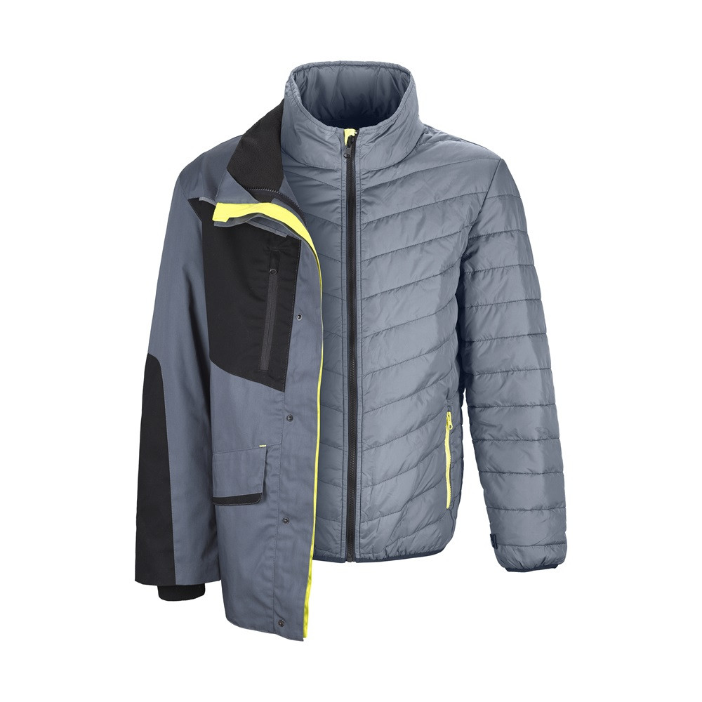 A 2 irányú cipzár lehetővé teszi a kabát könnyű szétválasztását, és a két réteg kombinálásával maximális védelmet és kényelmet nyújt a hideg, szeles, illetve nedves körülmények között végzett munkához.